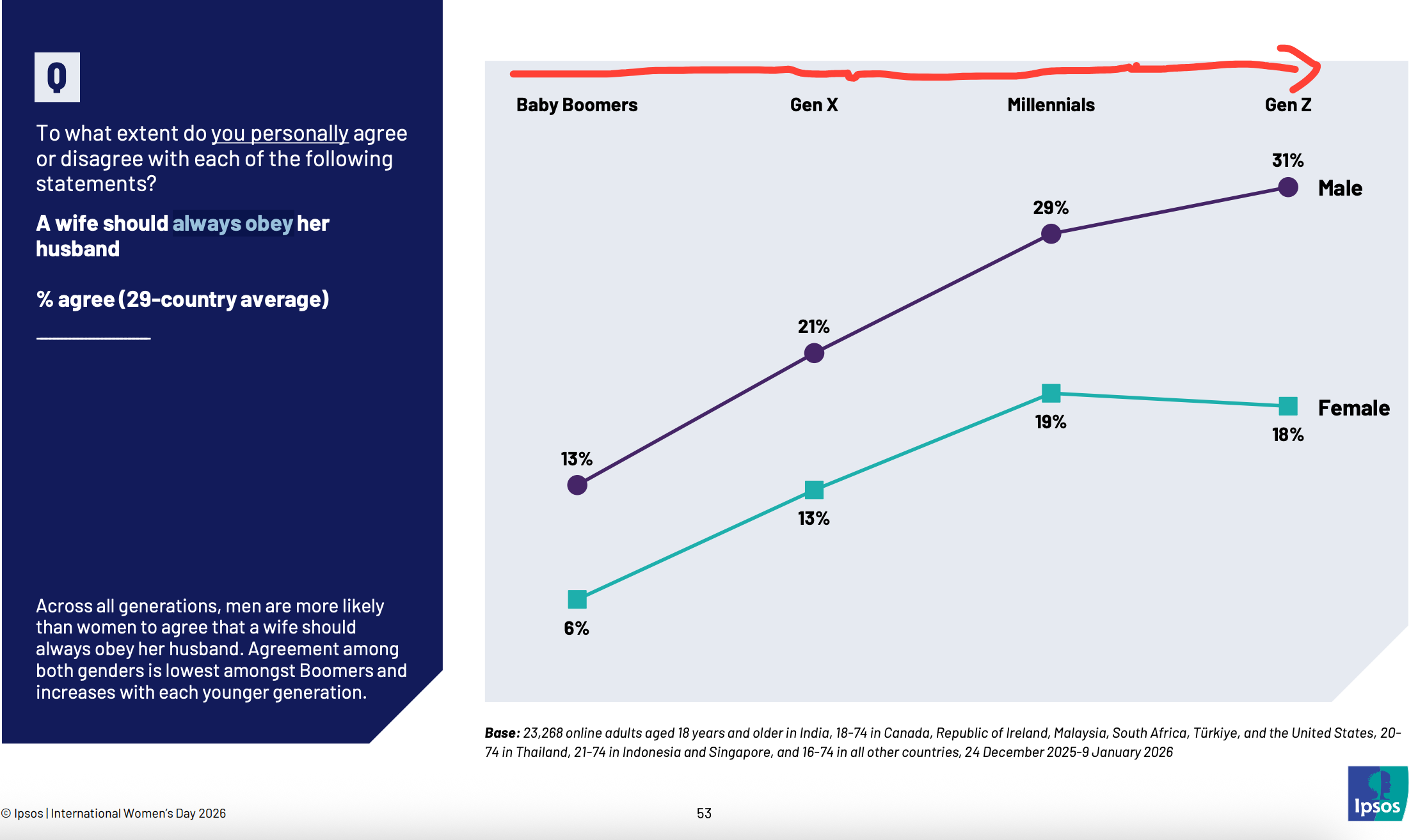 The idea that Gen Z men are significantly more misogynistic than Boomers has been floating around for a while, but it has recently received a newsbeat boost thanks to that Ipsos/KCL survey (conveniently timed to coincide with International Women's Day 🤔 ). And it is being quoted everywhere.