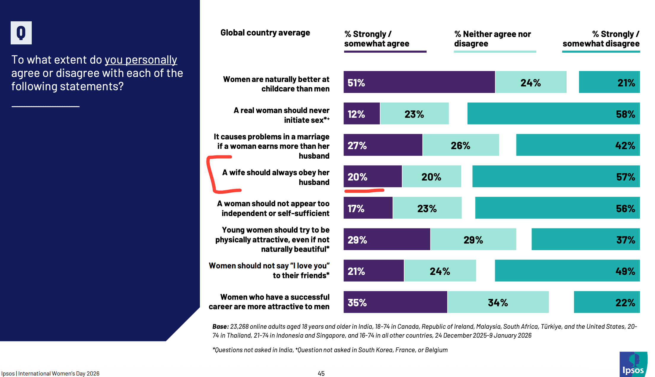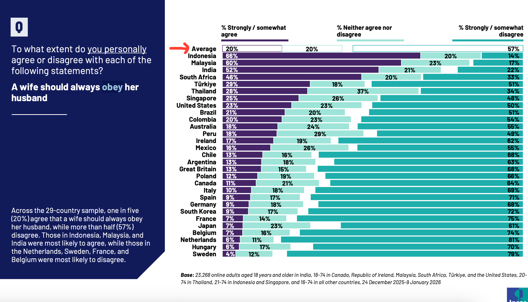Recently, there has been a news headline making the rounds based on a survey conducted by Ipsos on behalf of the Global Institute for Women's Leadership at King’s College London. The headline and takeaway: "Almost a third of Gen Z men agree a wife should obey her husband." The implication of the reporting—which ranges from The Guardian and USA Today to the BBC and ZME Science—seems to be that men are regressing, Red Pillers are taking over the world, and there may be no way out of this spiraling testosterone mess fueling a regression in gender equality.
