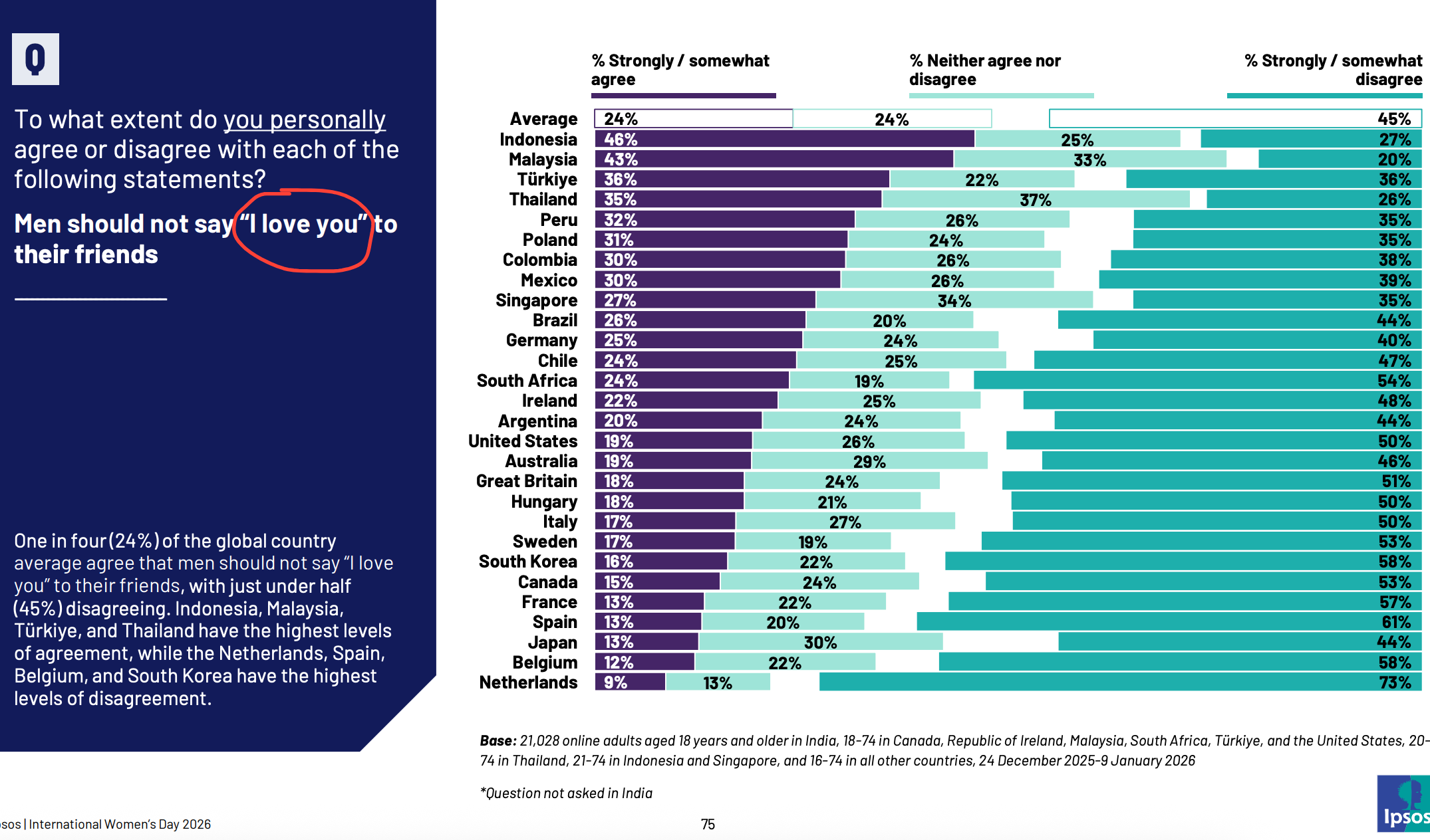 This is a 29-country global survey. That's 29 different cultures, and 29 different systems of cultural & social norms. How many ways and contexts are there to ask about agreement for a statement like, "Men should not say 'I love you' to their friends" Or "A wife should always obey her husband"? The sentiment of love might be expressed in a thousand different ways among friend groups, including all-male ones, but the actual phrase "I love you" may or may not be typical of your specific group context or cultural setting. It would take a skilled interviewer to be able to gain real insight into this kind of question – to be able to get to the question behind the question – in a way that an online "yes/no/don't know" type of survey simply cannot get at.